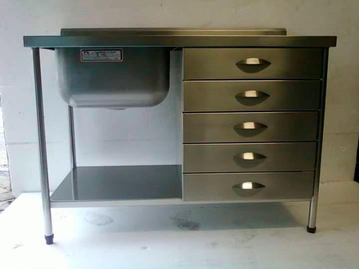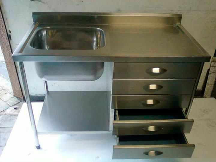 Algumas empresas optam por inserir armários embaixo da pia de aço, para deixar o ambiente organizado. No entanto, existem tipos que vêm acompanhados de gavetas e prateleira, sendo uma opção para armazenar utensílios industriais. De forma geral, a pia possui um design básico que promove modernidade ao ambiente.